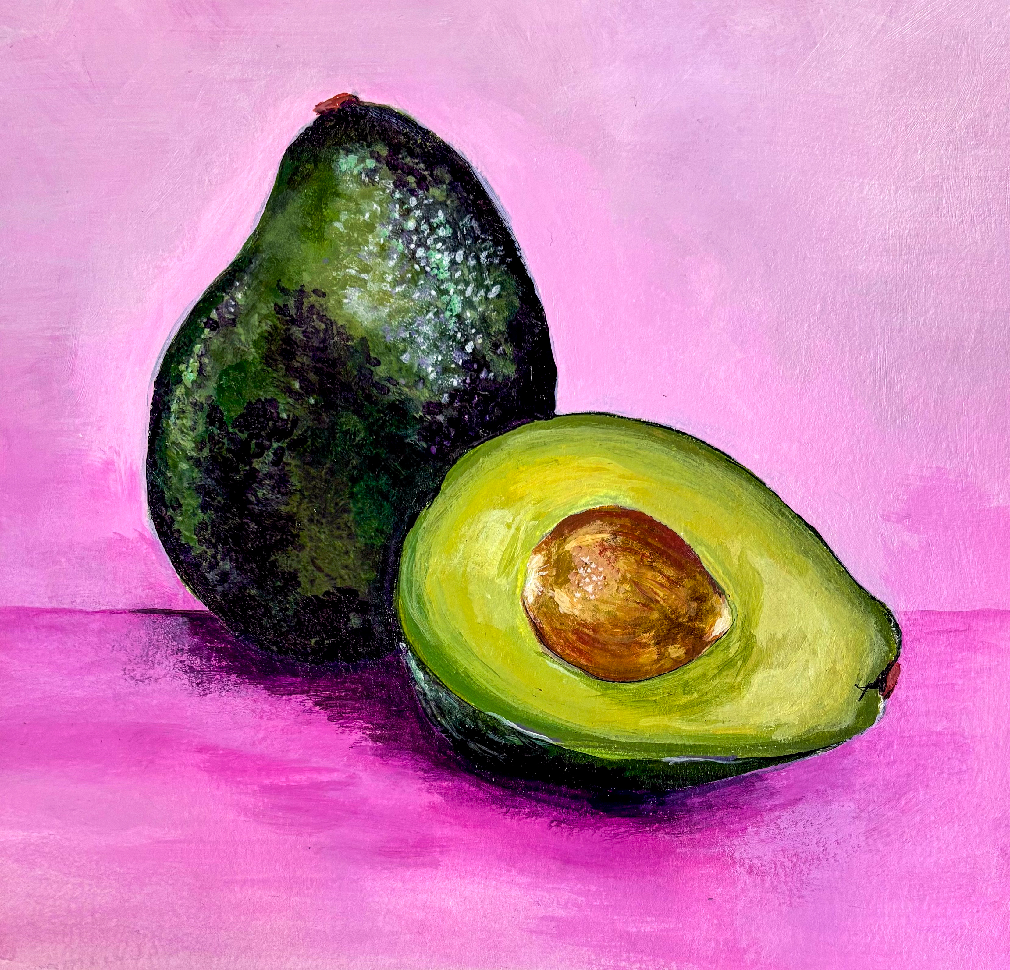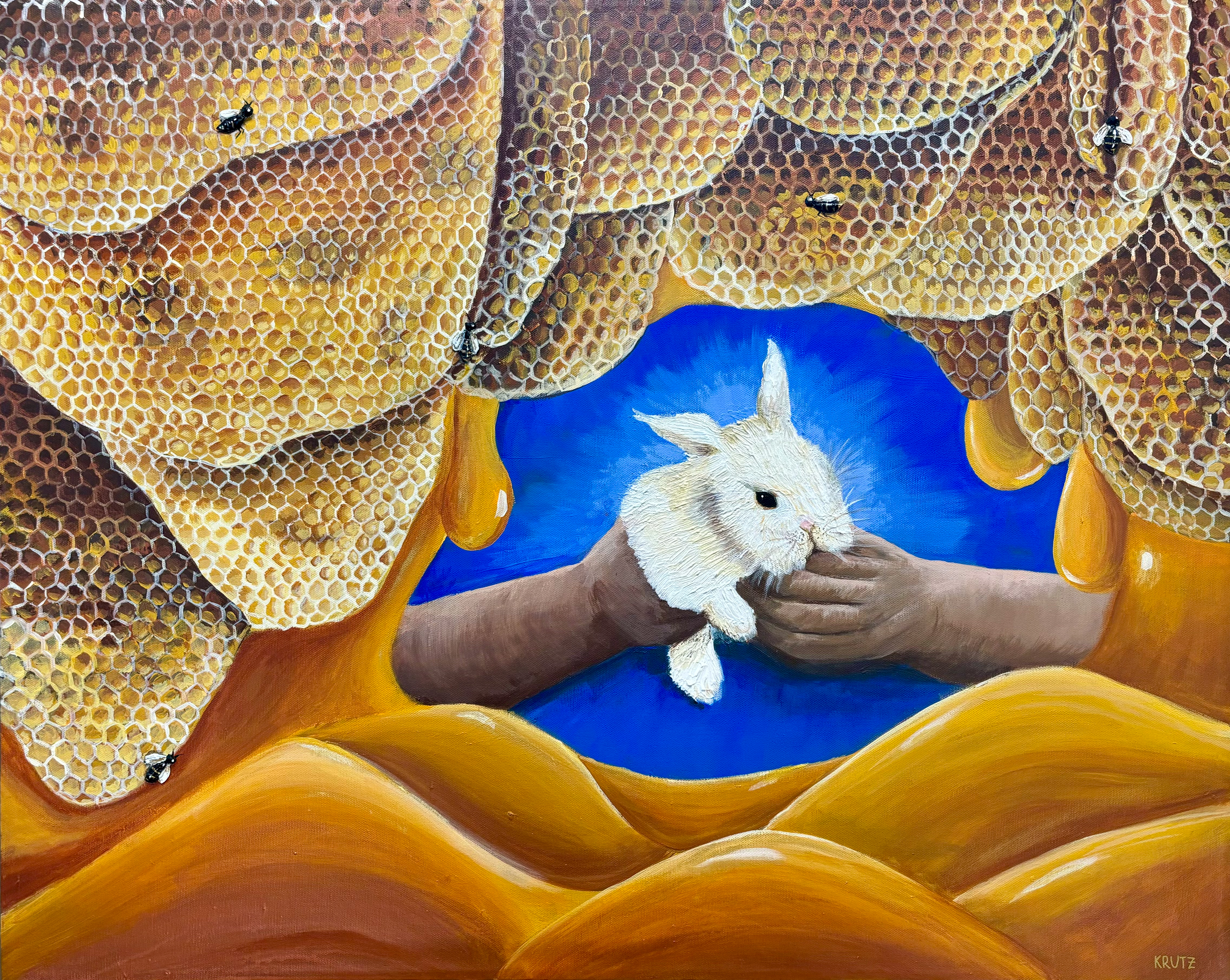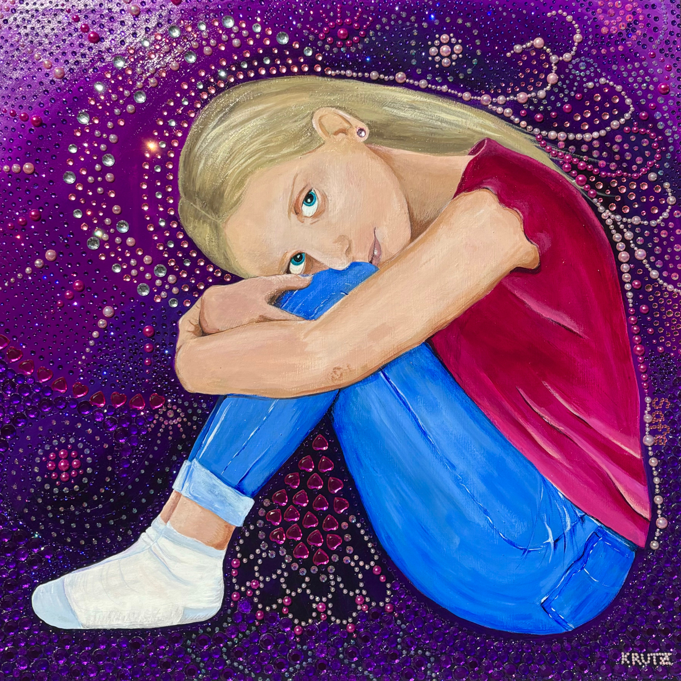 At the point of this painting in 2024, I’d never painted a self-portrait before, never painted myself as a child before, never used rhinestones to bedazzle a canvas before. This whole project was about experimentation. The hard plastic rhinestones encircle and protect the figure. Creating art is about experimenting, trying new things, making mistakes, and growing through it all.