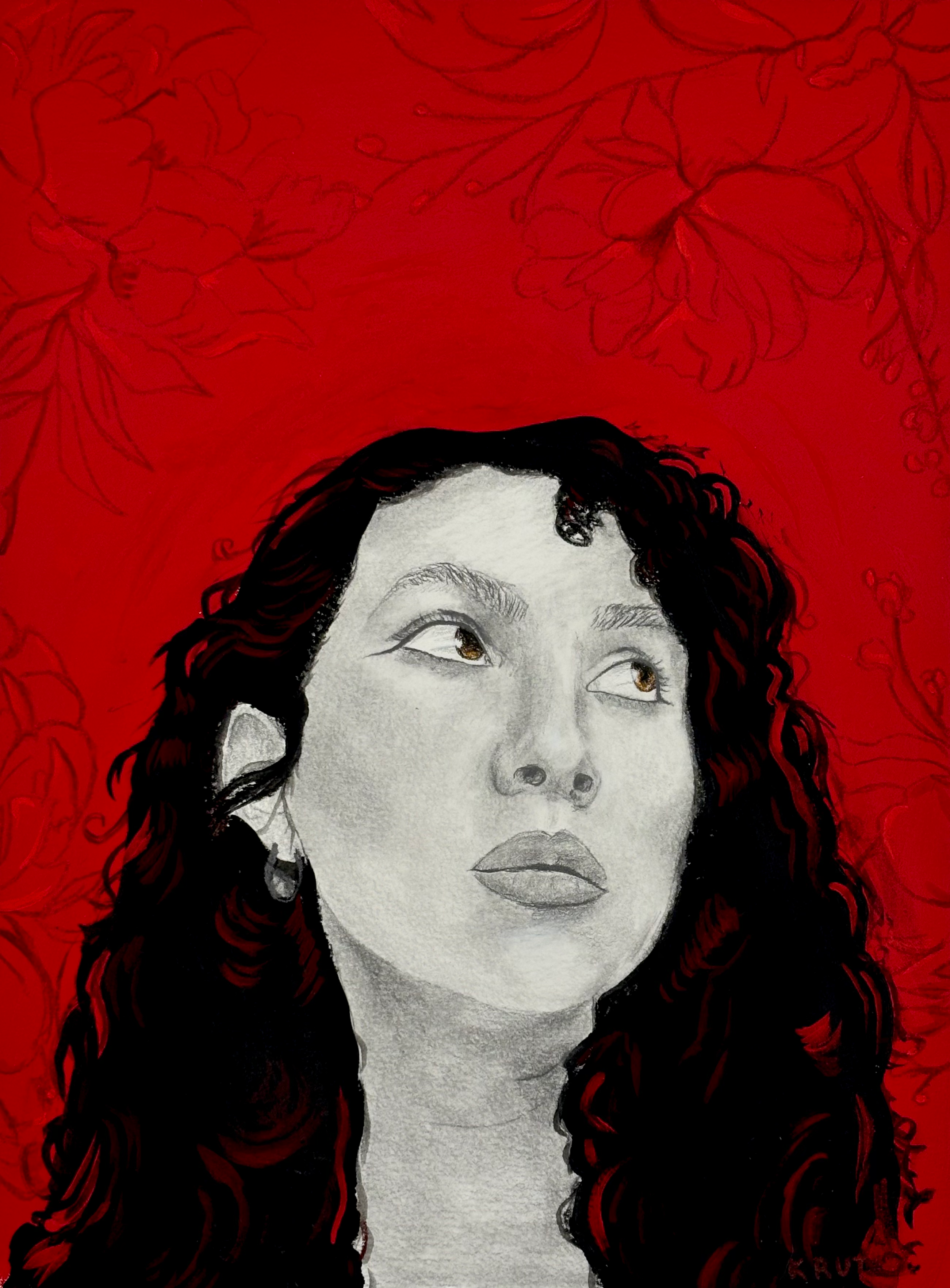 Original 9”x12” mixed-media artwork including graphite, charcoal, colored pencil, and acrylic paint of Annie